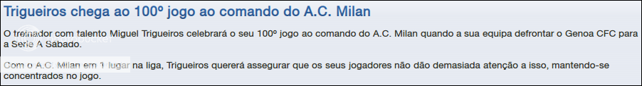 Em Londres tudo apontava para uma eliminação precoce do Milan. Sinceramente estava receoso que isso pudesse acontecer, mas confiava na minha equipa. Já com Rui Moreira apresentamos o melhor onze mas foi insuficiente. Fizemos uma estranha fraca exibição ao nível daquela em Madrid frente ao Atlético. Parece que 'congelaram' e deitaram tudo a perder. Eliminação precoce, mas justa. Para o ano há mais. Uma grande tristeza que sentimos todos, mas era culpa nossa.