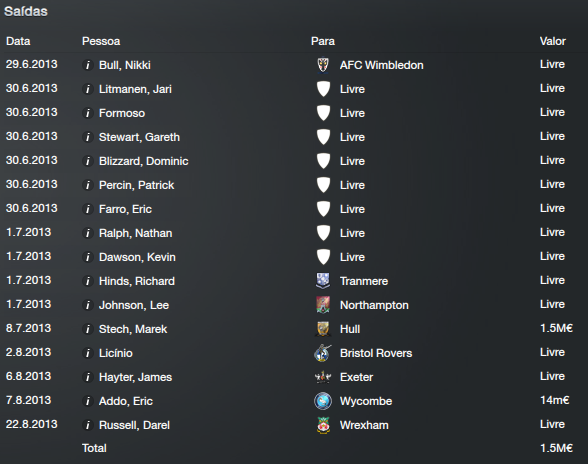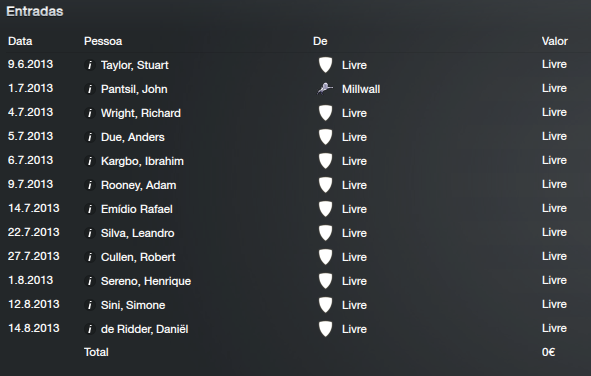 ![]() Tivemos um mercado muito agitado para o clube. Saíram jogadores velhos e sem qualidade para jogaram a Championship como no caso de Licínio, Formoso e chegaram muitas caras novas como no caso de Henrique Sereno, Emídio Rafael, Adam Rooney. Comecemos pelas saídas Uma das surpresas a sair foi o nosso guarda-redes titular Marek Stech. Não o queria vender, ele que evoluiu muito ao longo da época passada e a razão dele sair foi que mal conseguimos subir de divisão queria sair para clubes com mais dimensão. Falei com ele e disse-lhe que num prazo de 2 épocas estávamos na Premier League. Ficou satisfeito e disse que estava á espera disso, mas o mal foi quando tentei renovar com ele. Ele tinha apenas mais 1 época de contrato e pedia muito mais daquilo que lhe podia dar até que me decidi mesmo a vendê-lo. Recebi ofertas do Manchester City e do Hull City por ele apenas por 1.5M. Pensei que podia vender por mais, mas não chegou mais proposta alguma por ele. Com surpresa ele escolheu o Hull City que está na Premier League rejeitando assim o dinheiro das arábias. Litmanen a apenas 2 semanas sofreu uma lesão e com os seus 41 anos decidi não renovar com ele. Licínio após uma época que esteve melhor na 1ª parte do campeonato do que na parte final foi outro a sair por não ter qualidade para jogar numa 2ª divisão inglesa. Eric Addo foi um dos pilares da defesa na última época mas a 2 meses antes do final da época teve uma lesão que o impediu de jogar o final do campeonato, desceu nos atributos, principalmente na velocidade e tinha apenas mais 1 época de contrato e por isso foi á 1ª proposta que saiu. Entradas Ganhamos cerca de 1.5M em vendas e queria apenas reforçar a equipa com jogadores livres e foi o que aconteceu. Entraram Sereno, Emídio Rafael, Simone Sini, Daniel de Ridder, Robert Cullen, John Pantsil, Adam Rooney, etc.... Para compensar a saída de Marek Stech entrou para seu lugar Stuart Taylor guarda-redes que será o titular e também Richard Wright que será suplente. São bons guarda-redes com muita experiência e não chegou a entrar livre para o plantel o jovem esloveno Oblak, ele que foi dispensado do benfica, mas que pedia um balúrdio para assinar pelo Yeovil. Plantel Quem fez por merecer a renovação de contrato foram: Luke Ayling que fez mais uma enorme época e evoluiu imenso. Gonçalo Abreu que fez também uma enorme 2ª parte de época, ele que chegou apenas em Janeiro e decidiu alguns jogos. Paddy Madden que evoluiu imenso e foi um dos principais jogadores que contribuíram para a subida de divisão. Gavin Williams que decidi renovar contrato por apenas mais 1 época pois foi dos melhores médios da equipa. ![]() ![]() ![]() Agora acho que estamos bem preparados para a nova época apesar de achar que temos poucos defesas centrais e médios para uma nova tática que pus a treinar mas que não irei utilizar na pré-época essa que iremos defrontar os seguintes adversários ![]() Obrigado a quem acompanha e comenta Alguma ss peçam...