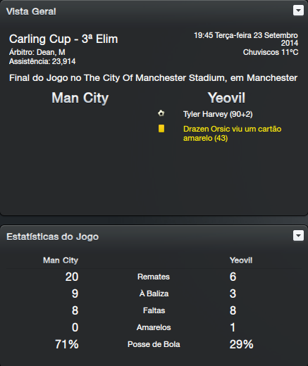 ![]() ![]() O nosso calendário para a Premier League começou com um jogo dificílimo contra o Manchester City, os adeptos do City já cantavam de galo a especular uma vitória fácil contra nós, mas não foi isso que aconteceu. Segiu-se uma série invencível para o campeonato até ao jogo contra o Arsenal, no qual tivemos a poucos minutos de conseguir um precioso empate, mas isso não aconteceu. Depois desse jogo tivemos 2 jogos contra o Liverpool e Chelsea jogos no qual eram favoritos e confirmaram esse favoritismo e terminamos os nossos 10 primeiros jogos na Premier League contra o Manchester no qual tivemos uma derrota pesada por 4-0 e essa vitória por parte deles foi merecida porque fizemos um mau jogo e não podemos fazer frente ao ataque deles. Calendário ![]() Classificação ![]() Últimas posições ![]() Alguns jogos ![]() Tempo para as Taças onde quero sair o mais cedo possível delas para manter os jogadores frescos para o campeonato. Mas isso ainda não aconteceu porque tivemos sorte nas vitórias que tivemos contra o Manchester City, onde coloquei um avançado júnior no ataque e alterei a tática e aos 92 minutos, Harvey tinha entrado na 2ª parte e marcou o golo da vitória que silenciou os adeptos adversários e assim passamos para mais uma eliminatória na Carling Cup. [url=http://i1291.photobucket.com/albums/b543/PauloPFR/vsblackpoolcarling_zps8e14b12a.png"vs Blackpool[/url]| vs Man. City | vs Reading Finanças As nossas finanças estão saudáveis e com tendência a ficarem muito melhores no final da época ![]() Extra As negociações para a compra do clube ainda se mantêm p que nos impede de tentar trazer reforços Obrigado a quem acompanha e comenta Alguma ss peçam… :adeus: