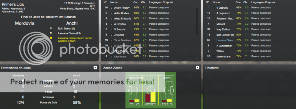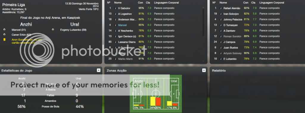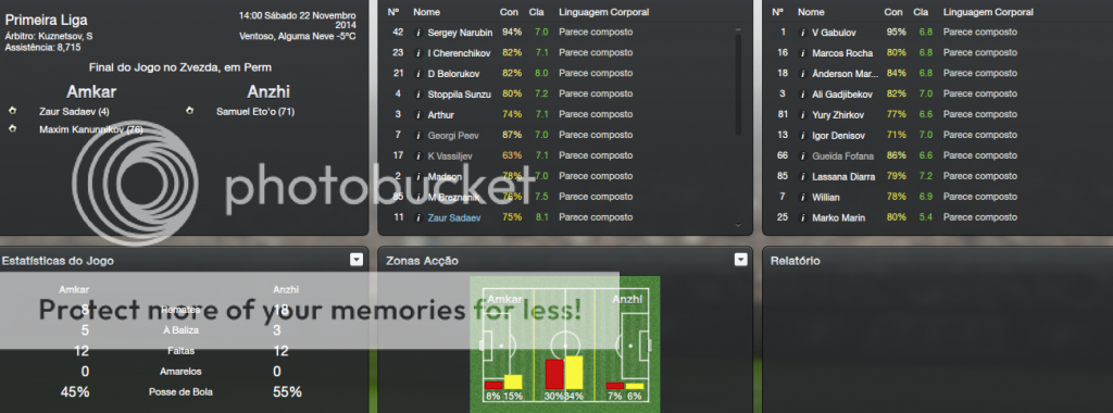(cliquem na imagem para ver as estatísticas) Depois recebemos o Braga num jogo decisivo para a passagem aos 16avos de final. O jogo começou mal, mas ainda na primeira parte resolvemos a questão. Depois na segunda parte Erkin fechou definitivamente as contas do jogo. Uma vitória frente ao Lech bastará para passar este grupo. (cliquem na imagem para ver as estatísticas) 3 dias depois estávamos prontos para o grande jogo. Recebíamos o líder CSKA Moscovo a 9pts de distância. Era vital vencermos este jogo. Sem Dzagoev, as expectativas não eram as melhores, mas não tínhamos muito por escolher, era ganhar e pronto. A primeira parte foi demasiado calma. Muito táctica. Ainda tentámos alguns remates, mas nada de muito perigoso. Mas na segunda parte tínhamos de arriscar mais, muito mais. E fomos subindo as linhas aos poucos... Até ao contra-ataque de 3 homens. Eto'o, Fofana e Willian. Eto'o levou a bola soltou para a direita para Willian e o extremo brasileiro colocou na área onde apareceu Fofana (substituto de Dzagoev) e fez o golo! 1-0. O jogo estava nas nossas mãos e assim ficou até final. Vitória importantíssima. (cliquem na imagem para ver as estatísticas) Logo após defrontarmos o líder, recebemos o vice-líder. O Krylja Sovetov, equipa revelação. Este jogo teve uma história muito simples e ficará por isso. Segunda parte, Samuel Eto'o. E chega. (cliquem na imagem para ver as estatísticas) Depois da tempestade, vem a bonança. Um ditado muito antigo e que se enquadra muitas vezes em situações reais. Desta vez aconteceu o contrário. Depois da bonança, veio a tempestade. Fizémos dois grandes jogo e visitámos o Amkar, uma equipa modesta. E o pior aconteceu. Deixámos 3 pontos em Perm. Muito injustamente, mas deixámos. Fomos donos e senhores do jogo, mas não marcámos e o Amkar, marcou. (cliquem na imagem para ver as estatísticas) No fim do mês recebemos o Ural, primeira equipa com quem joguei quando cheguei. Estávamos a chegar, portanto, ao meio do campeonato. Foi um jogo fácil, mas onde sofremos um bocado pela falta de eficácia. No final, recebemos os louros que não recebemos em Perm. 3 pontos naturais mas com um sofrimento evitável. (cliquem na imagem para ver as estatísticas) De volta à Liga Europa, fomos à Polónia confirmar o apuramento. Um jogo mais díficil do que esperava. Sofremos primeiro, mas logo acordámos e aniquilámos completamente o Lech em 15 minutos com 4 golos. Fácil demais quando estes meninos se inspiram. (cliquem na imagem para ver as estatísticas) 3 dias depois mais um jogo fácil em teoria, mas onde tivémos algumas dificuldades. Marcámos cedo e aos 23' tínhamos o resultado feito, depois limitámo-nos a gerir o jogo. Mais 3 pontos rumo ao título! (cliquem na imagem para ver as estatísticas) E para acabar o ano 2014 na Liga, recebemos o Rubin. Um jogo grande do futebol russo. Muitas dificuldades previstas. Mas no fim de tudo, acabou por ser fácil. Dominámos o jogo em todos os aspetos e 1-0 foi muito pouco para tal domínio. Acabamos o ano da melhor maneira. Um grande futebol! Em Fevereiro há mais. (cliquem na imagem para ver as estatísticas) Agora sim, o último jogo do ano. Recepção ao Leverkusen para cumprir calendário e mostrar que também somos fortes fora da Rússia. Fizémos um grande jogo, uma grande exibição e mostrámos à Europa que somos uma ameaça. No dia seguinte lá estava em Nyon antes de seguir para as minhas férias... Nota para uma coisa. Nesta fase de grupos, caso fosse a eliminar, teríamos elimando qualquer uma das 3 equipas... (cliquem na imagem para ver as estatísticas) E lá estava eu em Nyon, com a comitiva do Anzhi. Prontos para tudo. Desde Man Utd, passando por AC Milan, Benfica, Valência, Tottenham e acabando em Hapoel Tel-Aviv. Quem vier, morre! Calhou-nos em sorte o Athletic de Muniain, num sorteio positivo até. Uma equipa ao nosso alcance. Nos 8avos a sorte manteve-se do nosso lado. Defrontaremos, caso passemos, o Anderlecht ou o Hapoel Tel-Aviv. Se fizermos o nosso trabalho em Fevereiro, estaremos com um pé e meio nos quartos de final. Agora há que trabalhar e chegar bem fisicamente a Fevereiro... A classificação a 10 jogos do fim está assim. A 3 pontos do primeiro lugar estamos no caminho certo para chegarmos ao primeiro título da história do Anzhi. Destaque para o penúltimo jogo do campeonato. CSKA - Anzhi. Um clássico em Portugal. Em Portugal está 1 para cada lado, apesar do Porto (neste caso CSKA por jogar em casa) ter ganho os dois jogos. Nesse jogo teremos de ser o Benfica de 2010 e o Porto de 2013. Que a sorte esteja connosco.