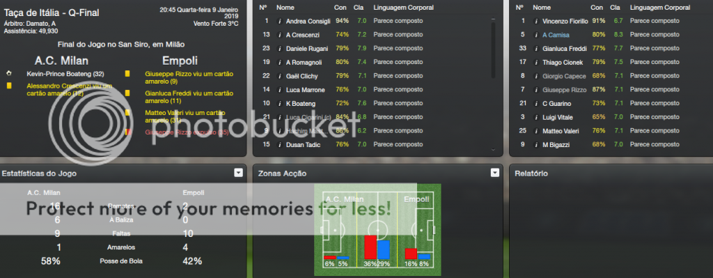 Dias depois recebemos o Empoli para a Taça, demos lugar aos menos utilizados e Prince resolveu o jogo aos 32' com um grande golo. Depois o Empoli ficou reduzido a 10 e só deu Milan. Resultado escasso, mas o que importa é a passagem às meias-finais, onde defrontaremos o Genoa, a duas mãos.