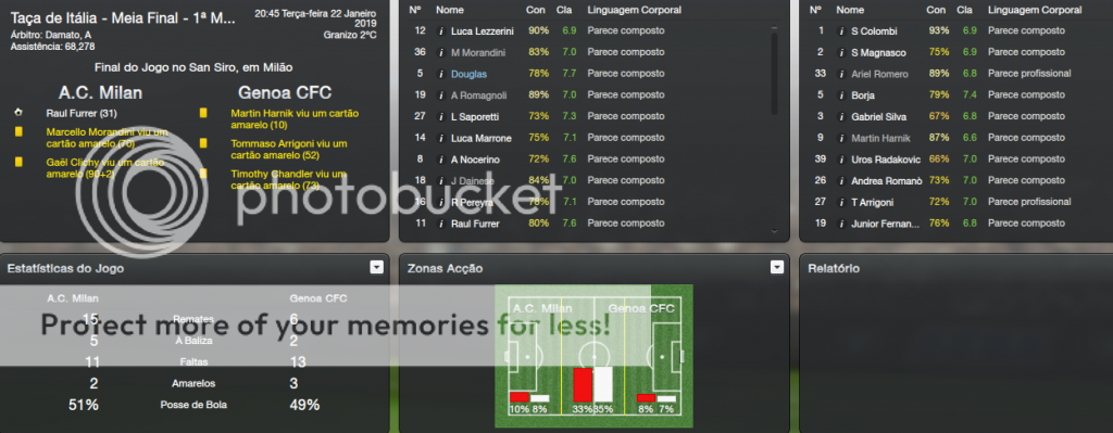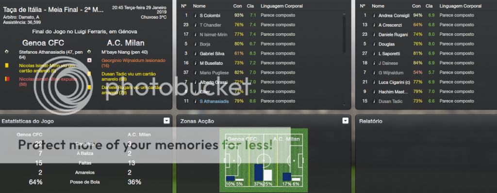 Para acabar, fomos a Génova jogar a passagem à final de Roma. Jogo super-difícil. Como seria de esperar eles carregaram desde a primeira jogada, onde inclusive remataram à barra. Mas aguentámo-nos e através de Niang fizémos o 1-0 de penalty. Senti a eliminatória ganha. Mas o pior estava para vir. Na segunda parte o Genoa empatou muito cedo e começou a massacrar-nos até ao 2-1 de penalty. Depois disso o massacre foi ainda maior e só terminou aos 88' com a expulsão de Isimat-Mirin. A expulsão tirou-lhes o último fôlego de tentar o golo da vitória e apurou-nos para a final. Foi uma exibição muito mal conseguida, mas no final da época lá estaremos nós, em Roma. Frente ao Palermo.