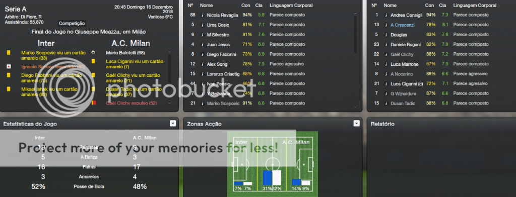 Seguiu-se o jogo pelo qual mais aguardava. O derby della Madonnina. No Giuseppe Meazza (transformado em San Siro quando jogamos em casa), o Inter era favorito, mas ganhar o derby enquanto visitante tem um gostinho extra. O Inter dominou e foi tentando de longe, mas raramente com perigo, e veio dos pés de Balotelli as melhores oportunidades. O avançado fez dois remates perigosos e Rugani mandou uma bola à barra. Isto na primeira parte. Na segunda, Clichy foi expulso aos 52' e vimos a nossa vida andar para trás. Mas aos 68' totalmente contra a corrente, Balotelli a passe de Pereyra fez o 1-0 final. Uma vitória preciosa que fez vibrar qualquer adepto Rossoneri.