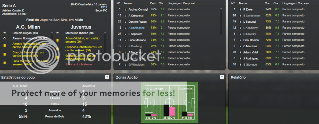 Seguia-se finalmente o clássico. Um clássico italiano, um clássico do mundo! Um jogo que apaixona milhões de pessoas e que as cola ao televisor. Desta vez jogava-se a liderança da Serie A. Estávamos numa série muito positiva e vencer a Juventus era o culminar dessa grande série. Portanto, entrámos fortes e dominadores e mandámos inclusive uma bola à barra que viria a ser um ensaio para o 1-0. Aos 40' Rugani fez o San Siro vir abaixo. Uma loucura! Quando voltámos do intervalo, aos 50' numa réplica do lance do 1-0, Romagnoli, que havia feito uma dupla inédita com Rugani, fez o 2-0 e levou o público, de novo, ao delírio. Era futebol de alto quilate. E aos 55' Petrucci numa jogada individual à Maradona quase fez o 3-0, mas esbarrou no poste. E 3' depois a Juventus, contra a corrente, a reduzir para 2-1. Aos 70' voltámos a acertar no poste. A 3ª bola no poste. E nesse momento pensei que com tanto azar, a Juventus ia acabar por chegar ao empate. Mas três minutos depois Lichtsteiner foi expulso e o jogo praticamente morreu ali. Mas aos 90' Romagnoli teve o prazer de aumentar para 3-1 o resultado final. Um jogo brutal da nossa parte que deveria ter acabado nuns 6-1.