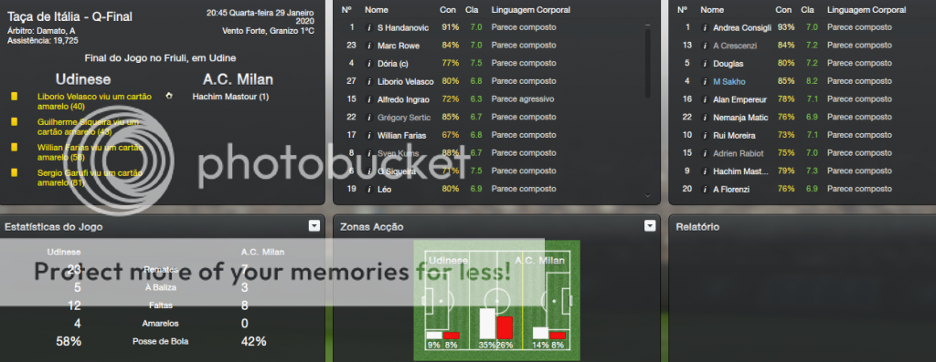 Para terminar esta série de 4 jogos fora de portas fomos ao Friulli para os quartos de final da Taça de Itália. Faltava-me este título no palmarés, portanto tínhamos de ganhar para chegar à final. No entanto, foi um jogo muito difícil e ainda estou para saber como o ganhámos. Fomos dominados, e só o golo madrugador de Mastour nos deu a vitória e a passagem à meia-final. A meia-final será frene ao Napoli. Uma eliminatória e pêras.