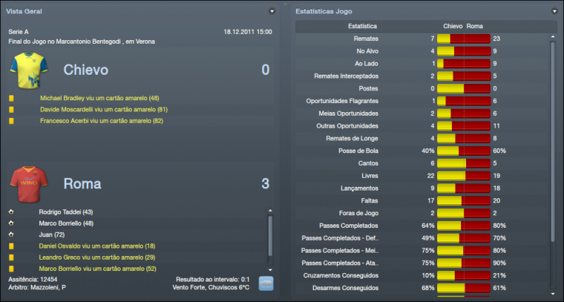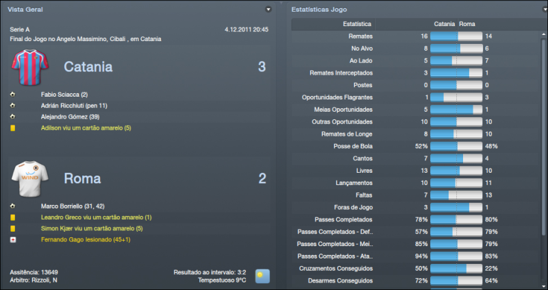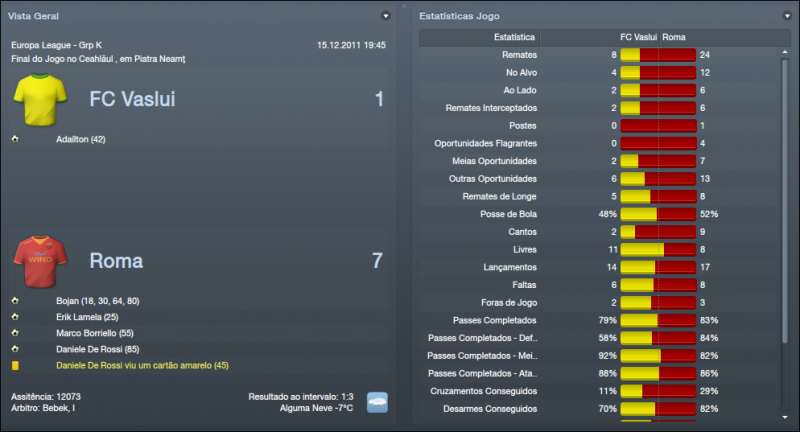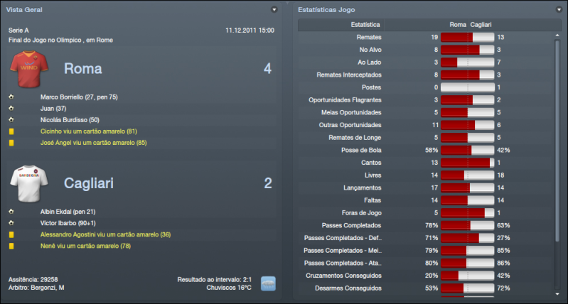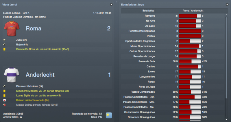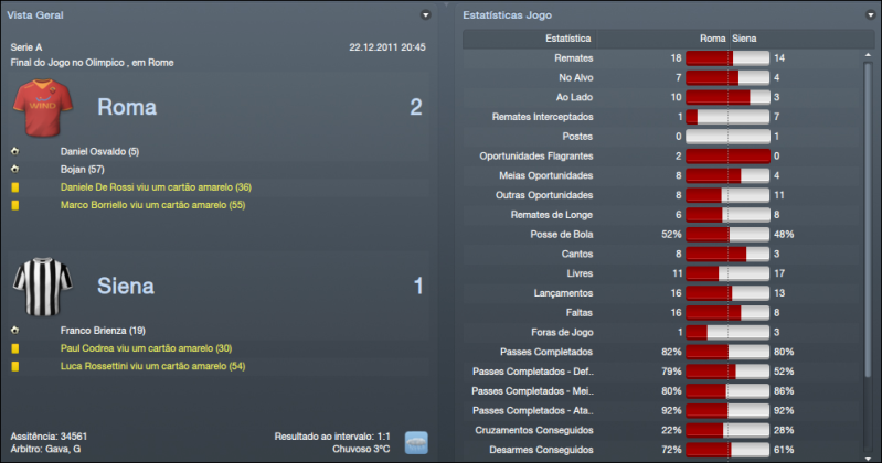 ![]() ![]() Anderlecht 2x1 © - Começávamos o mês de Dezembro para a Liga Europa diante do Anderlecht, equipa Belga que venci na 1ª volta na Bélgica por três bolas a zero. Começámos bastante mal o jogo com os Belgas a se adiantarem no marcador, mas a partir desse golo partimos para uma exibição completamente dominadora que só pecou pela falta de eficácia. O resultado é enganador, merecíamos ter vencido por muitos mais golos e não houve equilíbrio durante o jogo, mas o mais importante tinha sido feito. Ainda ia caindo em desgraça quando Juan faz falta dentro da sua área, mas felizmente o jogador falhou. Com esta vitória tínhamos assegurado a passagem à próxima fase juntamente com o Stoke. Catania 2x3 (F) - Jogo fora de casa diante de um adversário que está em perigo de lugares de despromoção, mas é, por norma, um adversário muito complicado em sua casa e não esperava facilidades e a equipa tinha de suar muito para levar de vencida o adversário. Foi um belo jogo de futebol, as duas equipas a procurarem jogar da forma mais atractiva e o jogo terminou com a vitória do Catania. Fizemos um bom jogo, mas a defesa não esteve nada bem, como já é apanágio. Gostei do que vi durante o jogo, só não gostei de ter perdido pontos, descemos nesta jornada para 6º lugar, longe do que eu quero. Cagliari 4x2 © - Encontro diante uma equipa que está tranquila na classificação, anda pelo meio da tabela e é uma equipa bastante chata que pode tirar pontos a qualquer equipa. Dominámos o jogo, não tivemos dificuldades para bater o Cagliari que mostrou ainda bons apontamentos a espaços. Só não gostei de ter sofrido dois golos estúpidos, mas isso já é habitual por aqui. Irei tentar trazer um defesa-central para o clube na reabertura do mercado. Voltámos às vitórias na Série A e mostrámos que a derrota na Sicilia foi um percalço. Vaslui 7x1 (F) - Voltámos à Liga Europa para ter o último jogo da fase de grupos diante do Vaslui. Já apurados, mas queria vencer para manter a confiança nos níveis elevados. Num clima frio com muita neve demos a maior goleada até agora no clube num jogo simplesmente perfeito. Adversário acessível, mas nunca pensei marcar sete golos num terreno adversário e ainda para mais num clima de neve, chuva, vento. Perfeito. Passámos o grupo em 2º lugar com 12 pontos, menos 4 pontos que o Stoke que teve uma fase de grupos quase perfeita. Chievo 0x3 (F) - Fora de casa, contra o penúltimo classificado, rodámos alguns jogadores devido ao jogo da Liga Europa, estavam alguns cansado e quis rodar a equipa. Apenas abrimos o marcador aos 43' minutos por Taddei e a partir daí foi tudo mais fácil e partimos para uma exibição de bom nível em que dominámos quase por completo o jogo todo. Borrielo marcou o segundo o golo e por fim Juan estabeleceu o resultado final marcando numa jogada de bola parada. Siena 2x1 © - Defrontámos outra equipa que está a lutar para não descer, mas por agora está a conseguir fugir com 3 pontos sobre o Cesena. Foi um jogo muito, muito complicado, mais do que se pensava à partida. 1ª parte foi dura, o Siena causou muito perigo. Abrimos o marcador aos 5' minutos por Osvaldo, mas rapidamente empataram e causou sempre muito perigo o Siena. A 2ª parte foi mais tranquila, dominámos o encontro com relativa facilidade e chegámos à frente do marcador por Bojan aos 57' minutos e conseguimos sempre manter o resultado e podíamos ter aumentado a vantagem. ![]() ![]() Começo por falar na Liga Europa. Acabámos a fase de Grupos em 2º lugar com 4 vitórias e 2 derrotas, 12 pontos. O Stoke City acabou em 1º lugar com 5 vitórias e 1 empate, 16 pontos. No modo geral, fizemos uma boa fase de grupos. À excepção dos jogos diante do Stoke em que estivemos bastante mal nos dois jogos. Nos encontros diante do Anderlecht e diante do Vaslui estivemos muito bem. Mostrámos e bem a nossa força nesses jogos, sobretudo diante do Vaslui em que goleámos nos dois jogos. Já houve sorteio da 1ª Fase de Qualificação. Não estava muito esperançado que saísse uma equipa acessível, por ter terminado a fase de grupos em 2º lugar e era pouco provável que calhasse uma equipa, digamos, fácil. Calhou-nos uma equipa de França, mais propriamente, o Lille. Equipa bastante complicada que conta com vários jogadores de grande nível. A maior estrela é, sem dúvida, Eden Hazard. Maestro Belga que promete dar cabo da minha frágil defesa. Também houve sorteio dos Oitavos de Final. Caso elimine o Lille irei defrontar o Rennes ou o Metalist. Esperemos passar esta fase que promete ser bastante dura. ![]() Perdemos apenas um jogo que foi diante do Catania, mas vencemos os outros três jogos e não estamos a deixar dúvidas que vamos lutar pelo apuramento pela Liga dos Campeões. A defesa parece estar a dar sinais de querer melhorar e isso só irá beneficiar-nos. Temos um ponto de avanço sobre o Nápoles e estamos a um pontos dos 3º classificado, o AC Milan. Acho que o 4º lugar aceita-se para a Roma, para já, mas queria chegar, pelo menos, ao 3º lugar. Inter de Milão parece estar a disparar na classificação em que tem 6 pontos sobre a Juventus que é 2º classificado. Temos estado a melhorar e acredito que iremos melhorar ainda mais. ![]() ![]() Tem havido muita rotação pelo plantel. É preciso rodar, devido estarmos em 3 competição. No que toca a golos, Borrielo e Bojan são os goleadores da equipa. Bojan é o melhor marcador com 17 golos seguido por Borrielo, que está a surpreender-me com 14 golos. Osvaldo também tem estado bastante bem, não é um goleador, tem mais assistências que golos e é bastante útil e está a ser até o melhor jogador do plantel até agora. Pjanic, Lamela, José Angel, De Rossi têm sido os pilares juntamente os outros mencionados. Gostaria de reforçar mais o plantel em Janeiro, mas o dinheiro não abunda para já. ![]() ![]()