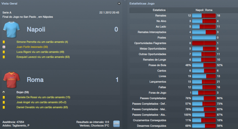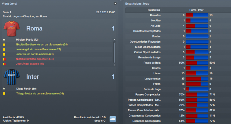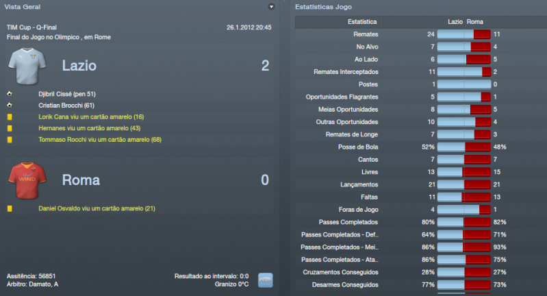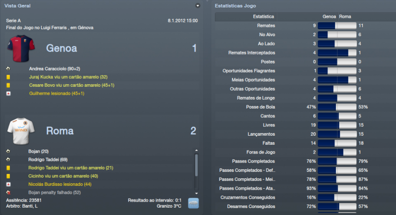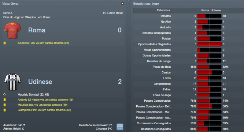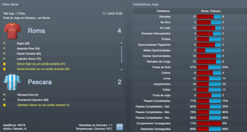 ![]() ![]() Génova 2x1 (F) - Jogo complicado, à partida. O Génova é sempre daquelas equipas chatas em que tiram bastantes pontos às equipas que estão na frente do campeonato. Foi um jogo em que controlámos do princípio até ao fim do jogo. Nunca achei durante o jogo que iríamos perder pontos. Mostrámos sempre muita segurança durante o encontro e o Génova apenas assustou quando fez o golo de honra, pensei que os meus jogadores iriam perder a cabeça, mas felizmente isso não aconteceu e conseguimos três pontos bastante importantes. Pescara 4x2 © Jogo para a Tim Cup diante do Pescara. Epá, mas que equipa mais chata que foi este Pescara durante todo o jogo. Não tivemos um minuto de descanso. Treinados pelo conhecido Zeman que só vê o ataque mostraram-se em grande nível no Olimpico em que criaram muitas dificuldades aos meus jogadores. Felizmente vencemos por quatro bolas a duas, mas não nos livrámos de um pequeno susto. A 2ª parte foi quase toda nossa e isso foi muito importante para levar de vencida o Pescara. Udinese 0x2 (F) Encontro diante de uma das melhores equipas da Italia, a Udinese e fizemos um jogo a roçar o ridículo. Mal atacámos a baliza de Handanovic. Estivemos muito mal neste jogo e foi neste jogo que mudei de táctica. Passei para o 4x4x2 clássico porque o 4x1x3x2 não andava a resultar, muitos jogos sofridos e quero mais espectáculo. Foi uma derrota de que eu não estava à espera, mas que tinha de continuar em frente porque havia mais jogos. Nápoles 1x0 (F) - Jogo complicadíssimo no San Paolo, casa do Nápoles. Decidi voltar atrás e voltar ao 4x1x3x2 e isso deu resultados. Vitória fantástica, quando ninguém esperava e conseguíamos uma pequena vantagem sobre o Nápoles que era 5º classificado atrás de nós. Das melhores vitórias até agora este ano, não acreditava que fôssemos vencer um estádio tão complicado. Lázio 0x2 (F) - Mais uma derrota para a nossa rival Lázio, desta vez para a TIM Cup. Fomos bastante inferiores a eles, sem dúvida. Criámos algumas oportunidades de perigo, mas a Lázio criou o dobro das nossas oportunidades, por isso, é um resultado justo. Mais uma vez, não conseguimos a nossa maior rival, o que está a desiludir os adeptos, mas haverá mais oportunidades. Era uma Taça que eu queria vencer, mas fica para o ano. Neste momento, temos apenas 2 competições. Inter 1x1 © - Jogo grande para acabar o mês de Janeiro diante do Inter de Milão. Que jogo do crl, não jogámos nada, mesmo nadinha e depois ficando com 9 jogadores em 12 minutos é obra, mas já é normal por estes lado. Felizmente, conseguimos empatar a uma bola e conseguimos aguentar o poder ofensivo do Inter, mas queria muito mais, especialmente quando estávamos com 11 jogadores. ![]() ![]() Subimos uma posição na tabela classificativa, para 3º lugar, mas só por causa que falta um jogo ao Milan que deverá ganha-lo facilmente. Estamos bastante bem, se conseguíssemos evitar algumas escorregadelas era perfeito, mas estou gostando a maneira como a equipa se está portando. Para o próximo mês já haverá Liga Europa diante de um adversário bastante complicado como é o Lille. Inter de Milão parece que está começando a ceder muitos pontos e a Juventus está a aproveitar e apenas está a 1 pontos de distância. Espera-se um campeonato de grande nível. ![]() ![]() Não há muito para falar na Taça de Itália. Eliminámos com alguma dificuldade o Pescara nos Oitavos de Final, mas depois fomos de vela perante a nossa grande rival de forma justa. Para o ano haverá mais Taça e esperemos conquistá-la para o ano. ![]() ![]()