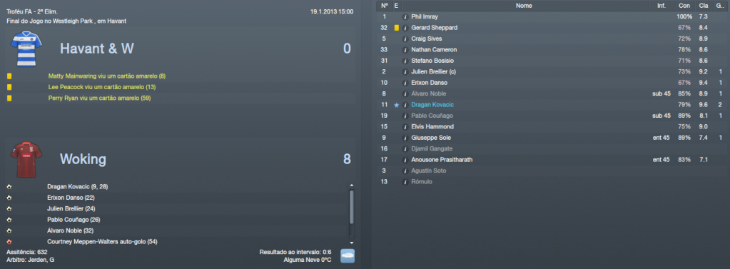 Mesmo com estas incertezas, temos 92 golos em 30 jogos, muito boa marca! Elvis Hammond recuperou da lesão sofrida em Dezembro, com o Hastings, e foi finalmente solução para um ataque desinspirado. Depois de jogar 24 minutos amealhou o primeiro hat-trick da época ![]() ![]() Em Janeiro fui obrigado a renovar com muitos jogadores em fim de contrato e acabei por desequilibrar as finanças até aqui seguras. Estamos €2m acima do orçamento semanal e era incomportável contratar quem quer que fosse. Apenas empréstimos a custo zero nos poderiam ajudar a fortalecer o plantel e quase ninguém quis vir para o Woking. Beckford já acabou o empréstimo no Hinckley, mas o Leicester não o quer emprestar, não percebo como é que ele fez meia época nesta divisão! Entretanto tentei reservas de clubes das 3 primeiras divisões e apenas um jogador aceitou juntar-se a nós - Um... em cerca de vinte. Nathan Cameron | Defesa Central, jogador das reservas do Coventry (Clube Mãe), razoável, mas útil, sobretudo por permitir que recorra ao Jack King como trinco, em alternativa ao Brellier e ao Gangate. ![]() ![]() Melhor jogo da época, rodei a equipa e vi espetáculo - de tal forma que a lista de marcadores não coube nas dimensões do meu ecrã! Nada de euforias, mas o próximo adversário está perfeitamente ao nosso alcance, num jogo que mais uma vez me opõe a uma das minhas equipas-fetiche, o Farsley (recém refundado, do Clube que treinei num FM anterior).