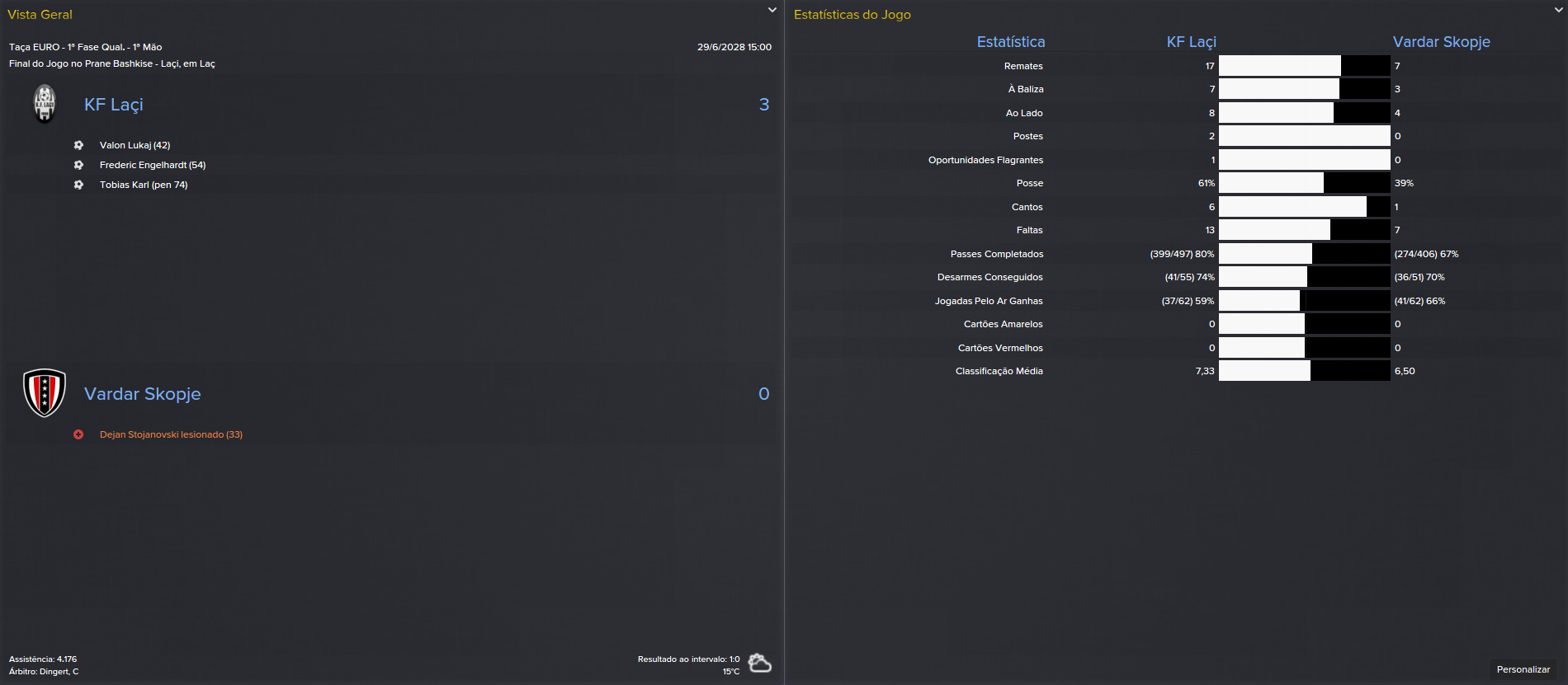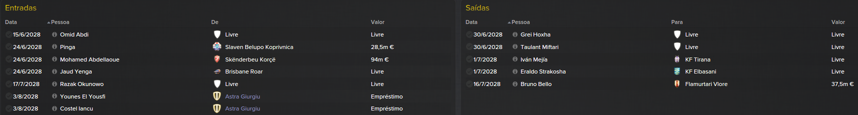 Com o aproximar da próxima época, fizémos uma mini-revolução na equipa. Muitos jogadores saíram em final de contracto e tinha assim de reforçar a equipa. No ataque tudo se manteve igual com Engelhardt, Karl e Lukaj a formarem o nosso trio de avançados. Os centrais também ficaram os mesmos e no meio campo apenas fomos buscar Godóy e Aarab (por empréstimo) para termos mais opções. O que tínhamos mesmo que reforçar era a baliza e as laterais defensivas. Para guarda-redes fomos buscar, incrivelmente, Bira ao Porto B. Nunca pensei que ele aceitasse vir para a Albânia mas o que interessa é que veio e passa a ser o dono incontestável das nossas redes. Para o lado esquerdo da defesa fomos buscar Al-Dossary que também joga no lado direito e resgatámos um jogador nosso que andava perdido em empréstimos constantes. Trouxémos ainda 2 extremos, 1 para cada lado. Mostafavi para a esquerda e McNaughton para a direita.