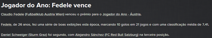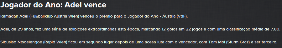 ![]() ![]() Pessoal, para despachar isto vou meter aqui o tempo que tive no Áustria de Viena, assim fico ao mesmo nível de onde estou a jogar. 2030/31 Cheguei ao Áustria de Viena depois de uma das mais desapontantes épocas do clube da capital austríaca. Acabou a época 29/30 em 6º lugar e por isso ficou fora das competições europeias. Pelo menos tinha menos carga de jogos para me concentrar no campeonato. Fizémos um grande investimento para esta época, como não podia deixar de ser, para podermos atacar o campeonato, que era o nosso principal objectivo. Ficámos assim com um plantel bastante aceitável. ![]() Fizémos uma época muito boa, para além do esperado. A partir de certa altura o campeonato tornou-se uma luta a dois entre clubes vienenses, nós e o Rapid. Tivémos alguns resultados estúpidos que acabaram por se revelar fatais. ![]() O campeão na minha época de estreia na Áustria acabaia mesmo por ser o Rapid, com apenas um ponto de vantagem. Acabou por ser um pouco frustrante porque podíamos perfeitamente ter ganho o campeonato, mas a situação em que o clube estava quando cheguei já foi muito bom. Não ganhámos nada, tendo a Taça sido ganha pelo Admira. ![]() ![]() No geral o nosso plantel portou-se muito bem, com o Adel a ser a nossa figura, tendo sido, inclusive, nomeado melhor jogador na Áustria. Claudio Fedele, Felipe e Pablo Quesada também fizeram grandes épocas. Peço desculpa por não meter nenhuma print, mas na altura não tirei e nesta altura já não fazia sentido estar a tirar. 2031/32 Nesta nova época, como já tínhamos uma boa base e conseguimos manter a maior parte dos jogadores, tivémos apenas que fazer alguns ajustes, de forma a atacar as competições europeias, que apesar de não estarem no topo dos objectivos, sabe sempre bem fazer boas campanhas. Ficámos com um plantel muito bom, com Bruno Oliveira a ser claramente a nossa estrela. ![]() ![]() ![]() ![]() ![]() ![]() ![]() Na Champions não conseguimos fazer a gracinha frente ao Ajax, e assim acabámos por descer para a Liga Europa. Aí sim, fizémos uma boa campanha, vencemos um grupo relativamente fácil, com apenas 1 derrota no último jogo. Frente ao Liverpool, espantámos tudo e todos ao conseguir a qualificação e depois, frente ao Club Brugge, não sei o que se passou, mas acabámos por ser humilhados na Bélgica. ![]() Na Taça, as coisas acabaram por não correr bem outra vez, acabámos por ser novamente eliminados dos Quartos de Final, desta vez às mãos do Salszburg. Quem viria a ganhar a competição foi o Rapid. ![]() No Campeonato a conversa foi outra, fomos muito mais regulares que o ano passado e fomos premiados com a conquista do título! Somos campeões! ![]() ![]() Mais uma vez o nosso plantel esteve em grande plano, com Bruno Oliveira a ser o nosso artilheiro de serviço, como já se esperava. Fedele foi considerado o melhor jogador do Ano e Gallardo o de Melhor Guarda Redes. E assim fica terminada mais uma etapa neste enorme desafio. Faltam apenas dois países para despachar a letra A, Azerbaijão e Argélia, vamos ver o que me espera na próxima época! ![]()