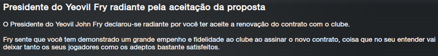 ![]() John Fry: Miss Kate, pode chamar o nosso treinador? Kate: Sim senhor é para já. . . . . Kate: Coach Paulo, o senhor presidente pediu-me para o chamar. PG: Ok, já lá vou ter. . . . PG: Mandou chamar-me Mr, Fry? JF: Sim, mandei chama-lo para rever-mos as expetativas para esta 2ª metade da época, de momento quero que escolha uma destas PG: Muito bem, como ainda falta muito para jogar e não querendo desapontar a direção escolho uma posição na metade superior da tabela, sei que tenho capacidade para mais, mas as lesões e o cansaço pode pregar partidas ao longo do tempo que resta para se jogar. JF: Muito bem, antes de se ir embora quero apresentar-lhe a renovação de contrato, sei que falta pouco para o seu vínculo acabar, e sei que me pediu para rever o seu contrato por isso quero tenho a seguinte proposta para a renovação. PG: São valores aceitáveis mas queria mais anos de contrato. JF: Antes preferimos que renove até á próxima época e depois logo veremos PG: Muito bem. Negócio fechado ![]() ![]() JF: Estou feliz com a renovação do seu contrato e sei que os adeptos e jogadores também ficarão satisfeitos. Até logo Paulo, se precisar de alguma coisa você sabe o caminho até aqui ![]()