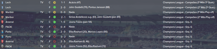 Liga dos Campeões (época passada): Nos oitavos apanhamos o Celtic, uma equipa acessível, em que apesar de dominarmos lá, acabamos por empatar, mas em casa, ganhamos facilmente. Nos quartos apanhamos uma equipa muito mais difícil, o Schalke, uma 1ª mão extremamente complicada na Alemanha ditou-nos já uma possível eliminação, 3-0 foi um resultado bastante elevado para o que se passou no jogo, um 2-0, ou até mesmo 2-1 era o mais justo, porque a superioridade do Schalke não foi assim tão suprema. Depois, em casa, ganhamos o jogo por 4-1, mas não foi o suficiente para passar às meias-finais, fomos eliminados com uma sensação de injustiça, merecíamos mais, mas para o ano cá estamos outra vez e tentaremos chegar até aqui e fazer melhor.