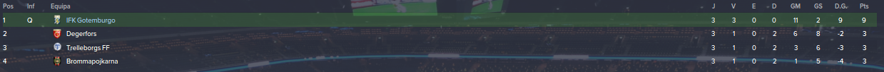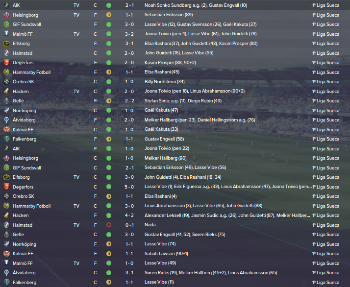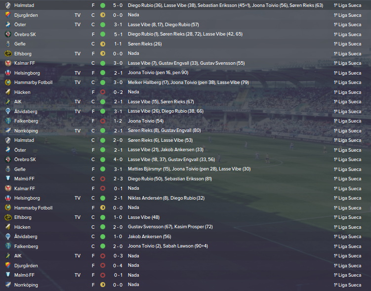 Campeonato: Uma época muito renhida, mas esperava pior, A defesa é um bocado péssima, tenho que me reforçar melhor. Muitos deslizes, muitas borras, mas lá conseguimos ser campeões por 1 ponto. Elfsborg e Kalmar sempre ali na luta, mas consegui ser mais constante e garantir um título que para além de ser o 1º na Suécia e logo na 1ª época, é um indicador de ida à Champs, ou seja, encaixe de milhões de euros, que me vão ajudar imenso na próxima época a talvez renovar empréstimos e a comprar gajos decentes/ao nível de revalidar o título.