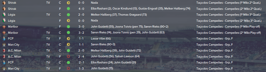 Champions: Uma Champs com eliminatórias acessíveis, apenas 1 empate nos play-offs, com imensas vitórias seguidas e depois um empate em casa, não percebi o que o jogo queria, mas pronto, lá conseguimos dar a volta em casa deles. Quando ao grupo, um grupo ridiculamente difícil, com Bayern, United e Zenit. Tínhamos o objectivo de lutar pelo 3º lugar com o Zenit e pensei que fosse mais difícil, mas o Zenit foi uma equipa muito fraca, apanhamos equipas mais fortes nas eliminatórias anteriores. Conseguimos 2 vitórias contra o campeão russo que nos punha logo na Liga Europa, ainda conseguimos um milagroso empate em casa contra ao United e um resultado à fm na Alemanha, mas não chegou para passar em 2º. Tivemos 2 derrotas pesadas, mas já era de prever, o Bayern foi uma equipa muito forte e o United em casa é uma coisa de outro mundo.