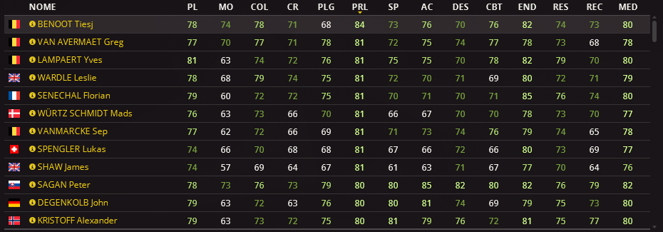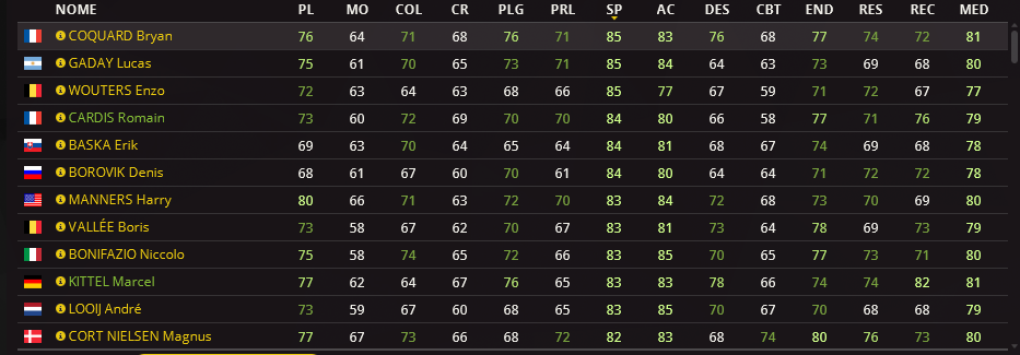 [USER=1980]@Pikachu[/USER], Para começar deves proteger os teus lideres para a maioria da energia ser gasta por um gregário poupando-os para o final. Depois não podes ir a ritmos alucinantes o tempo todo tens de encontrar um ritmo que não te "sufoque" e que dê para manteres a posição no pelotão. Eu por exemplo vou, depois da fuga estar constituida a 55 até 50 km para a meta onde vou aumentando gradualmente o ritmo consoante a velocidade do pelotão, isto em etapas planas, óbvio que nem sempre é possivel mas na maioria das vezes dá. Se quiseres seguir a roda de um sprinter melhor, tens de estar a uma distância curta dele senão ele vai perder demasiada energia a chegar à sua roda. Se fizeres um comboio não podes estar a 99 cursor de esforço a 18 km da meta (a não ser que tenhas 9 elementos para to fazer mesmo assim é algo arriscado. Agora também depende da tua equipa o ritmo que levas. Imaginemos um cenário: Terpstra - Tony Martin - Boonen - Renshaw - Cavendish. Começas a 8 km da meta Terpstra a 85 cursor de esforço para ganhar uma boa posição. A 5 km do final mete o Tony Martin a 90/95 para reforçar a tua posição no pelotão. A 3,5 Tom Boonen a 99 até aos 2,5/2 km para o fim para colocar o teu comboio na melhor posição possível. Aí sai o lançador (Renshaw) a sprintar e a 1,5/1 km do fim sai o Cavendish. É a minha técnica agora pode não ser perfeito mas acho bastante boa. Agora óbvio que isto não é certo e por vezes tens de alterar mas ao ganhares a tua a própria experiência chegas lá
